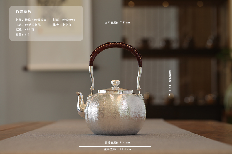 | 产地:云南大理 | 流行元素:李小白长嘴银壶 纯银9999 | 颜色分类:500克900毫升 600克1000毫升 700克1100毫升 800克1200毫升 1000克1300毫升 |